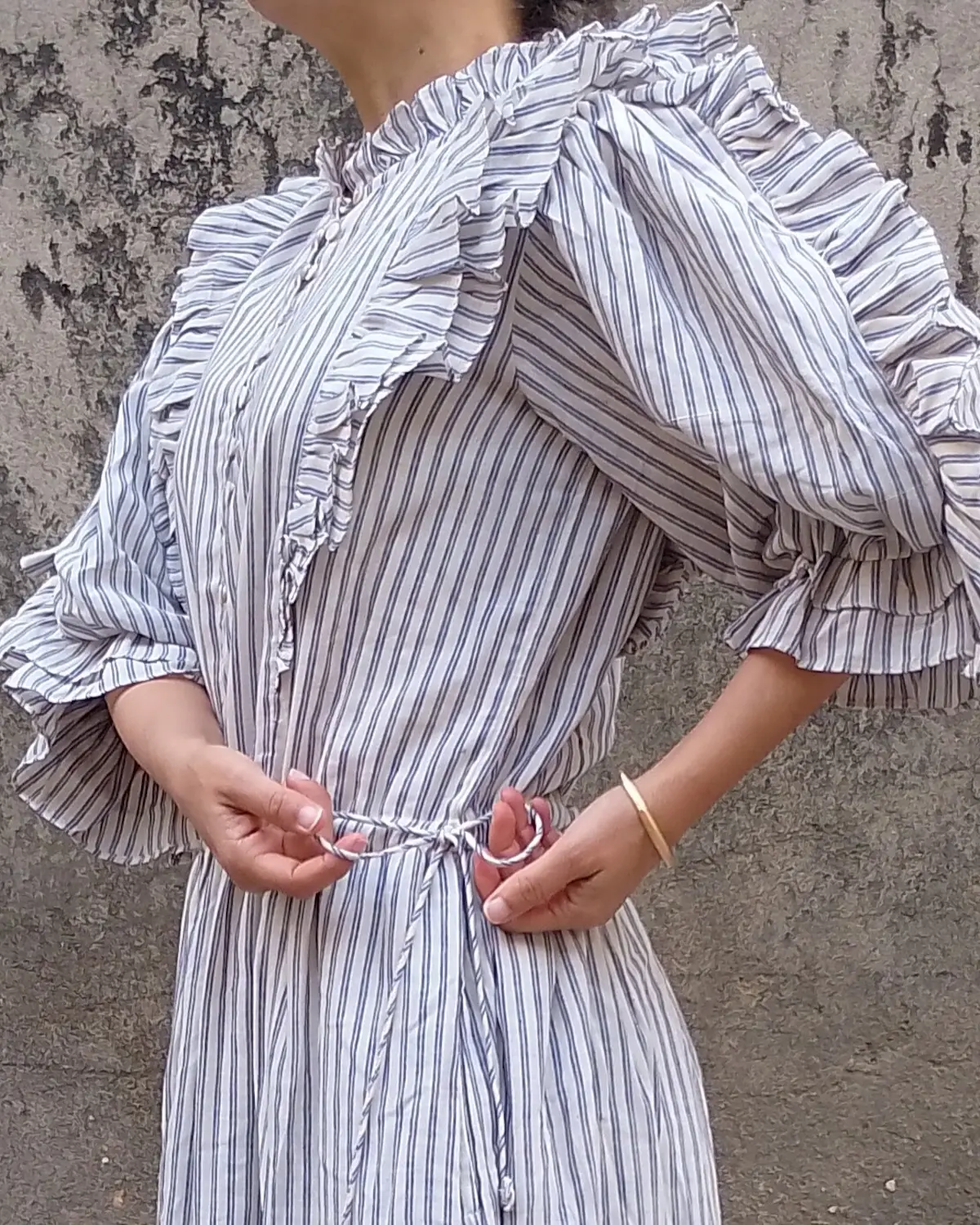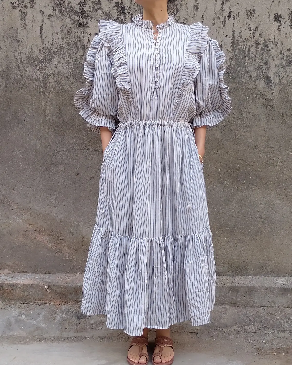 Romantic frill detailing and generous puff sleeves add movement and quiet volume, giving the dress an easy femininity without feeling overworked. Lightweight and breathable, it’s made for warm days, slow travel, everyday wear, and moments when comfort matters as much as beauty.