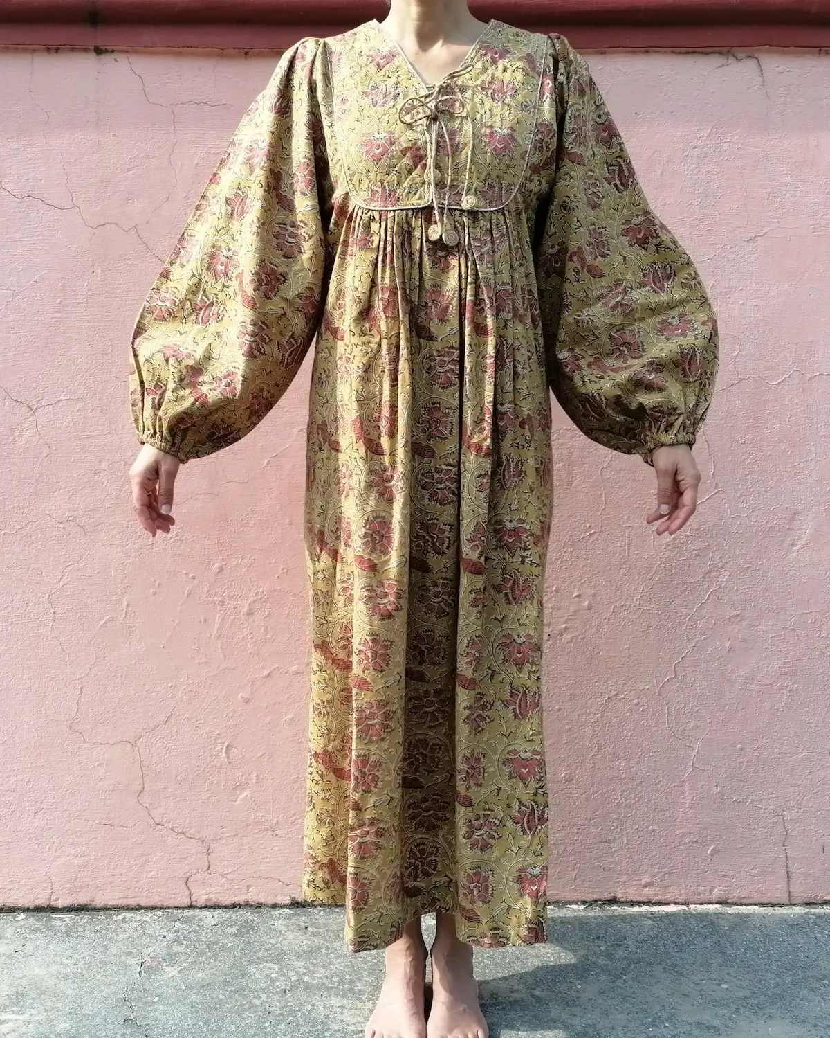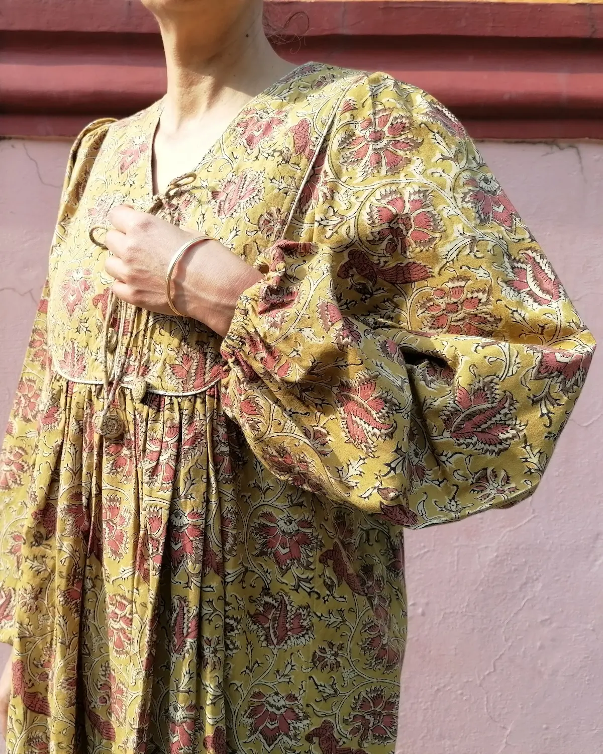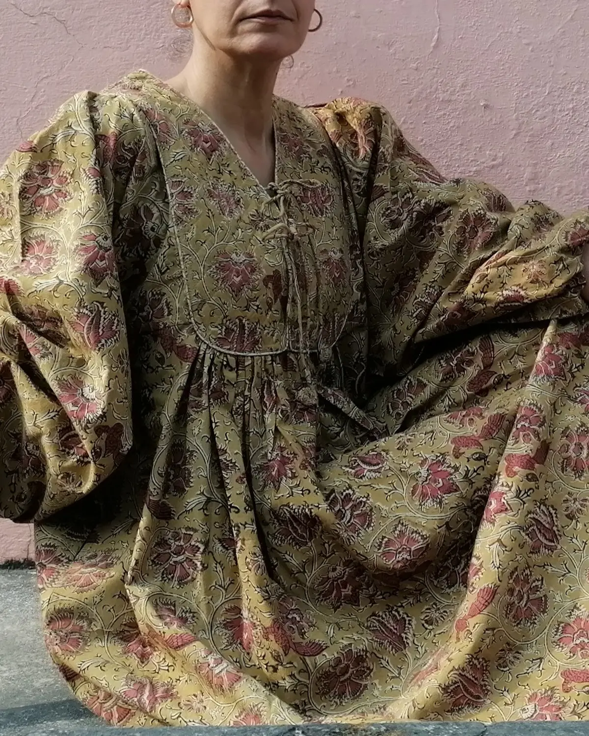 This handwoven organic cotton quilted dress features a tie-front and exclusive black floral block print on a natural Ochre vegetable dyed cotton base. Soft, breathable, and ethically made in small batches, it blends effortless style with sustainable slow fashion. Perfect for layering, casual days, or lifestyle occasions in the UK and USA.