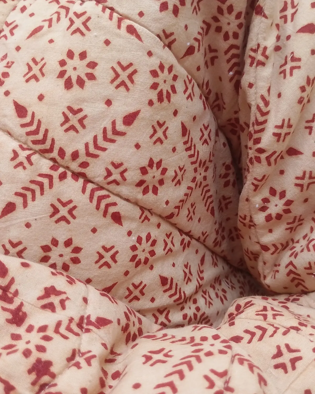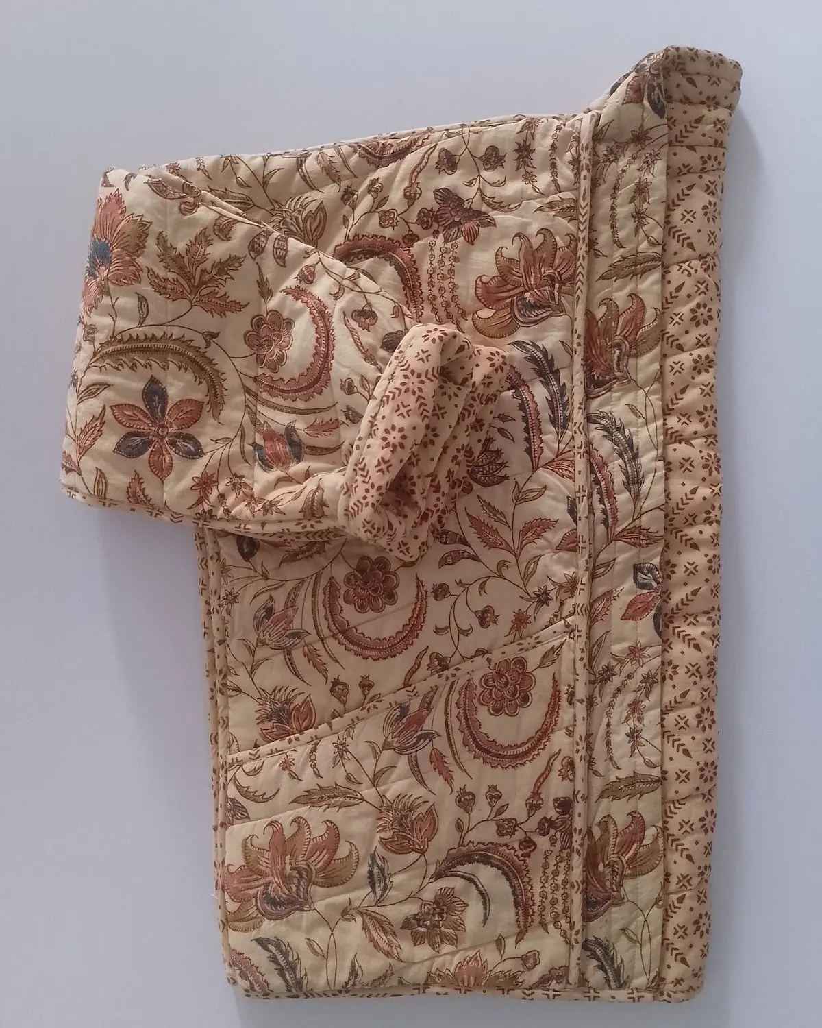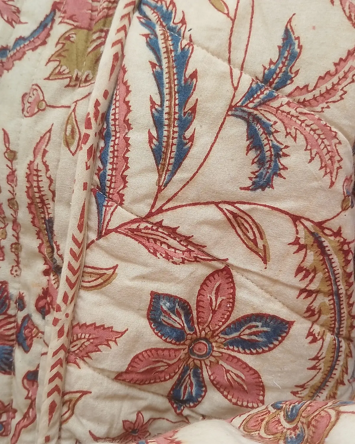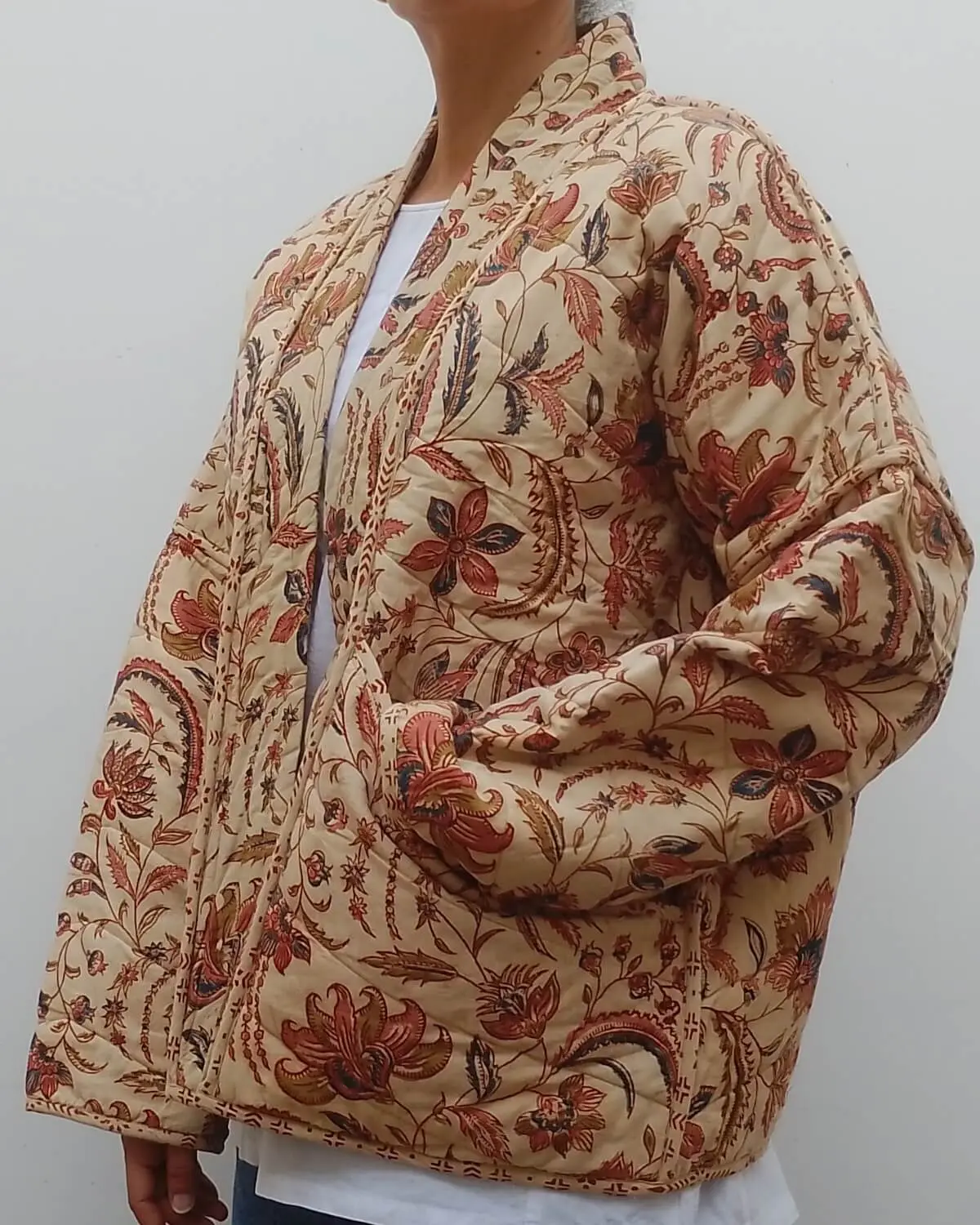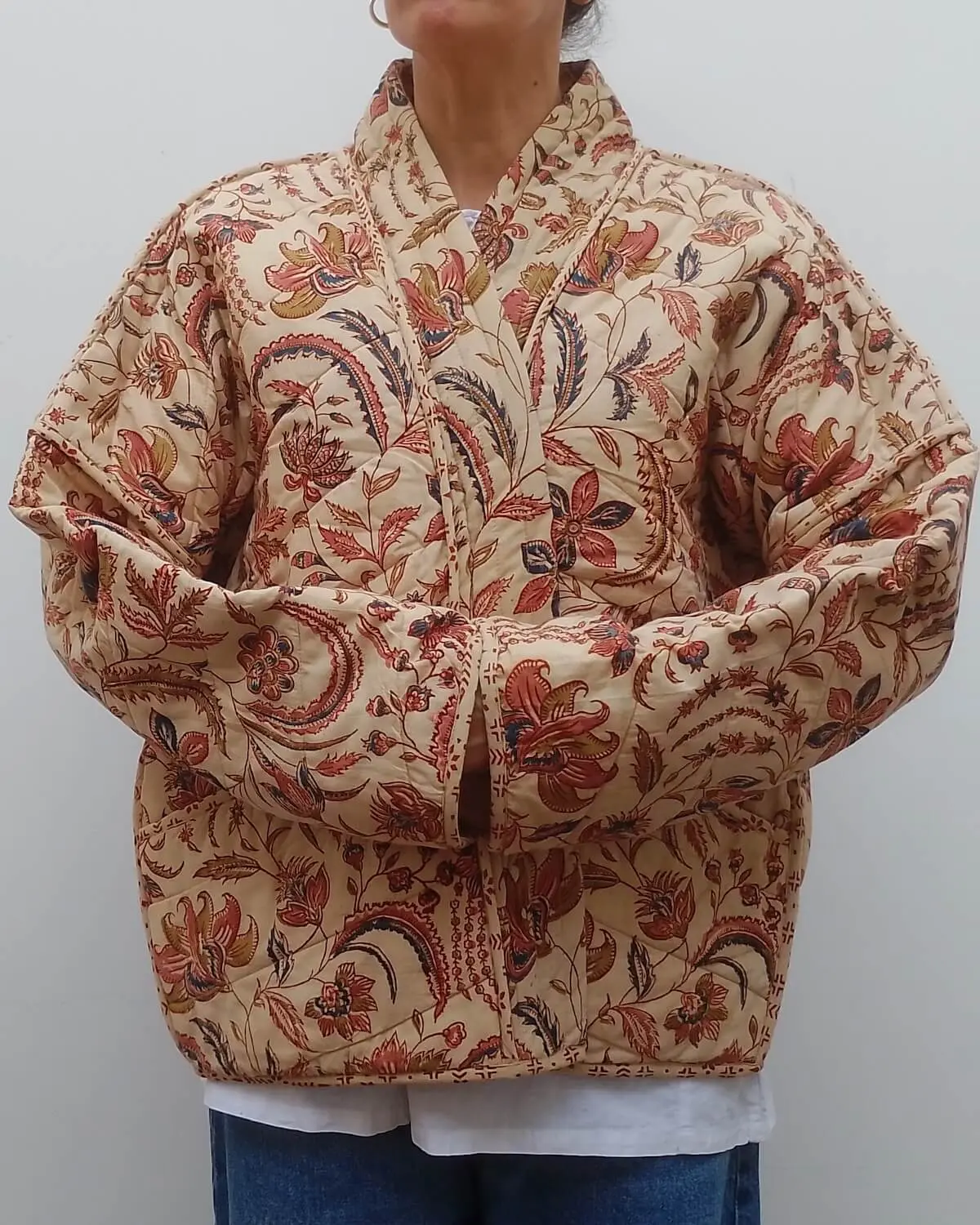 A beautifully crafted reversible kimono jacket made from organic khadi cotton, featuring traditional hand block printing by skilled artisans. Lightweight yet softly quilted, it’s designed for easy, year-round layering with two unique looks in one.